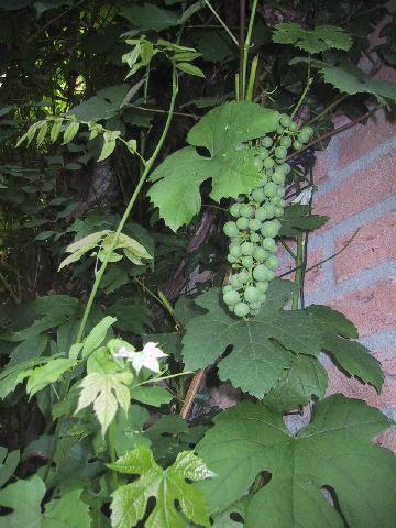 Zouden we binnenkort onze eigen 'Chateau Puf' kunnen gaan maken? In onze voor- en achtertuin groeien de druiventrosjes inmiddels uit tot flinke trossen.