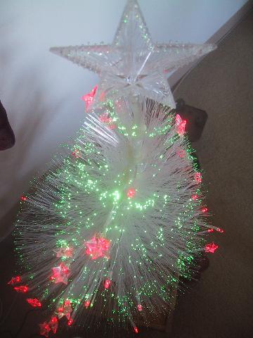 Vorig jaar in de uitverkoop gekocht. Deze glasfiber-kerstboom is in alle opzichten fout, maar wel erg fascinerend. Op de foto is 'ie net groen, maar hij is afwisselend rood, groen, wit, roze/blauw, wit, rood enzovoort.