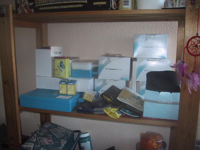 Spulletjes van mijn 'sponsor' Disetronic (sinds november overgenomen door Roche Diagnostics). Niet alleen gebruik ik een insulinepomp van hun, ook mijn bloedglucosemeter komt daar vandaan. Dus heb ik een hele plank gereserveerd voor teststrips, lancetten voor de vingerprikken, batterijen voor de pomp, dozen met ampullen die ik zelf vul met insuline, dozen met cathethers (die tenderdozen), en natuurlijk reserveonderdelen voor de pomp.