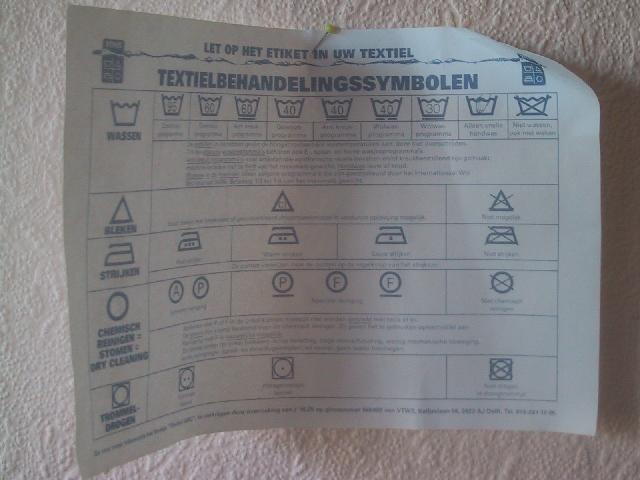 Omdat ik ooit eens flink de mist in gegaan ben (zijden hempje te warm gestreken), heb ik nu een lijstje boven de strijkplank hangen met alle textielbehandelingssymbolen (hoeveel levert dit woord op met Scrabble?).