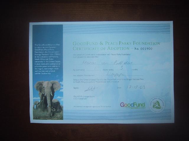 Sinds een paar weken heb ik een adoptieolifant! Althans, gedurende drie maanden heb ik een stukje van vrouwtjesolifant Limpopo geadopteerd (meer sponsoring dus). Ze is samen met haar familie verhuisd naar dit natuurreservaat omdat op hun oude stek teveel olifanten waren en dus te weinig eten.