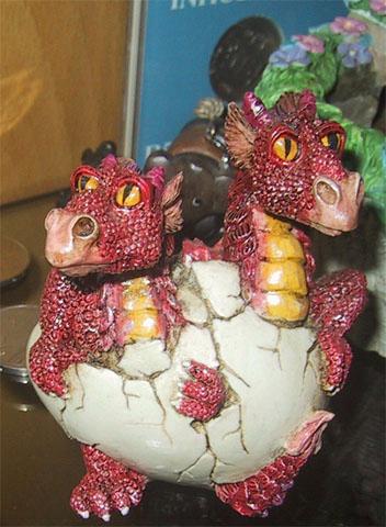 Na jarenlang opgesloten te hebben gezeten in een krantenprop in een verhuisdoos, zijn ze weer boven water: de tweelingdraakjes van puf. Ze hebben nu een mooi plekje in de vitrinekast gekregen.