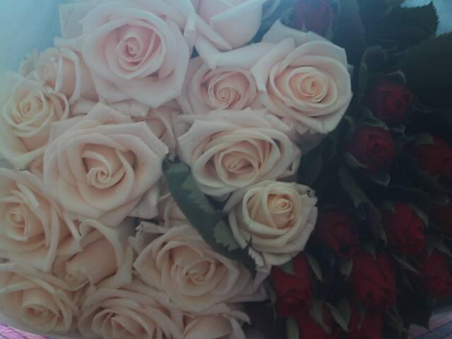 Ik wilde dit bosje eigenlijk NIET omdat het zo Ajaxig (of hier in de omgeving: zo FC Utregs) is. Maar de bloemenjongen begreep me niet helemaal, dus kreeg ik deze toch mee. Nou ja, het is eigenlijk rood-lichtroze, dus zo voetballerig is de bos niet ;o)