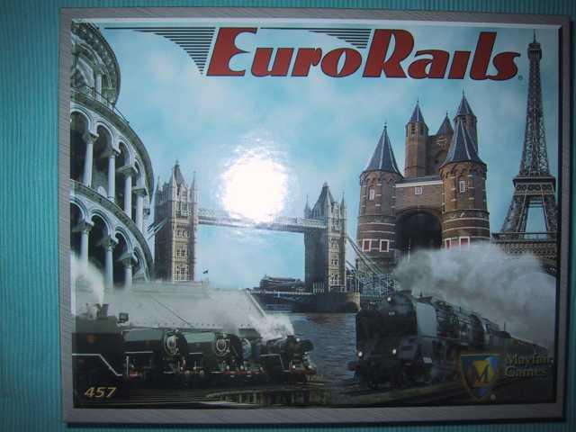 Een van de meest recente spellen die we hebben gekocht: Eurorails. Bij de meeste spellen zijn we heel voorzichtig met de borden, maar op dit speelbord moeten we met wascokrijtjes onze spoorwegen uitstippelen. Via die routes moet je dan bijvoorbeeld chocolade uit Brussel naar Oslo brengen of wijn van Bordeaux naar Berlijn.