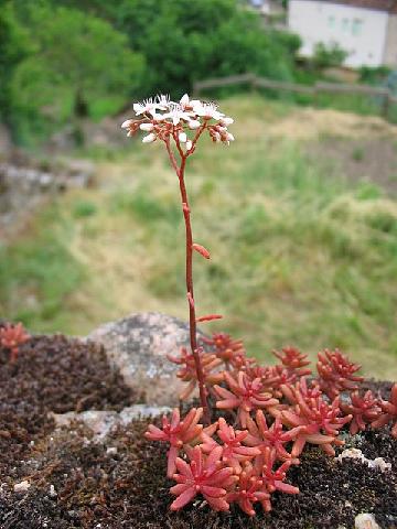 De eerste keer dat me dat opviel was in de botanische tuinen in Utrecht, dus ik denk dat 't niet geheel spontaan is. Maar mooi is 't wel. Zoals hier een bloeiend vetplantje dat we op vakantie tegenkwamen.