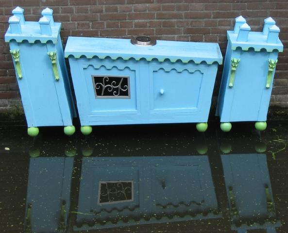 Toen we langs de gracht in Amersfoort liepen, zagen we allerlei kunstige objecten in en boven de gracht. Wat het allemaal was, weten we niet, maar het was in elk geval boeiend.