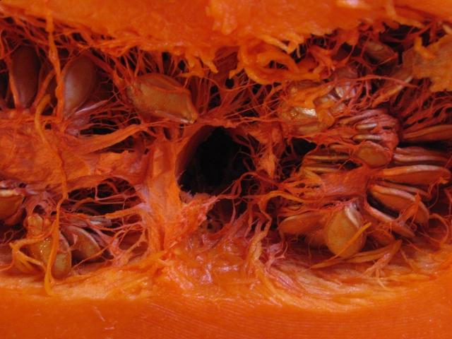 Zo ziet het er wel erg goor uit, maar de soep die je van pompoen kunt maken is erg lekker. Kippenbouillon, blokjes pompoenvlees, Billy Boy-en, en dan nog glazig gebakken uitjes en paprika erbij en room er door.. JUMMIE!