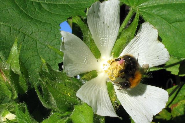 Toen het laatst zo warm was (wat lijkt dat al lang geleden zeg), zat de tuin vaak vol met hommels. Het zal wel iets met de aanwezigheid van alle bloeisel te maken hebben gehad. Maar sinds ik snap dat hommels niet prikken, vind ik 't niet zo erg meer als ze d'r zijn. Sterker nog: ik durf zelfs foto's van ze te maken.