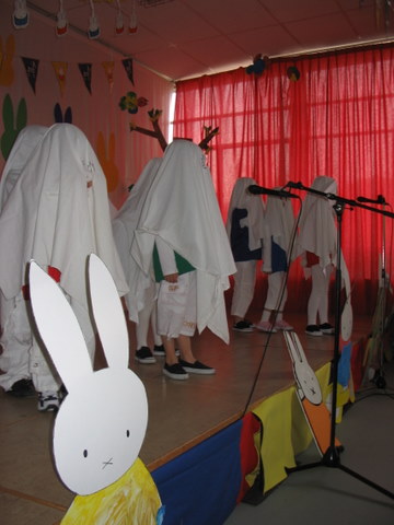 Een van de liedjes die de kinderen uit groep 1 en 2 zongen tijdens de Nijntjeshow, was 'Spook'. Ook 'Op de fiets', 'Logeren' en 'Limonade' kwamen voorbij. Maar mijn favoriet is toch 'Konijnen-3', met een heerlijke K3-beat.