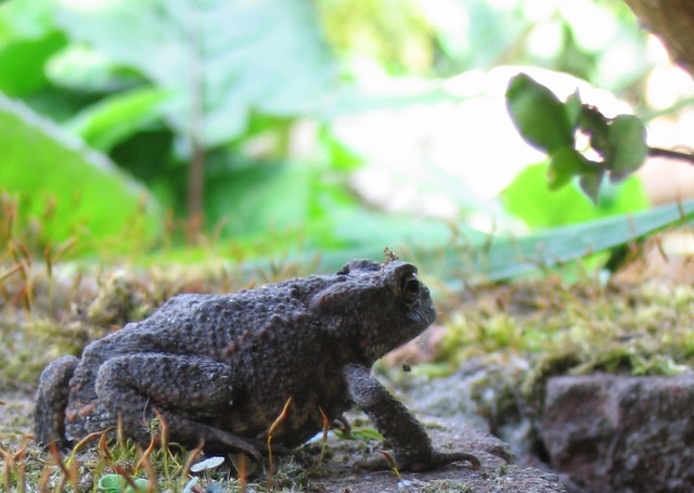 Dit is koning Pad, die resideert in onze tuin. Tijdens zijn dagelijkse wandeling zet hij altijd zijn kroontje op. Het vijvervolk zou maar eens niet doorhebben wie ze voor zich hebben. Koning Pad weet dat hij lange tenen heeft, dus gaat hij - ter bescherming van hem en de zijnen - nooit op pad zonder zijn kroon. Voor je 't weet, schiet hij te snel een paddenfluim in een oog en heeft dan direct spijt.