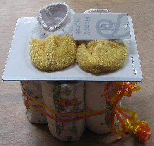 Vrienden van mijn zwager hebben net hun tweede zoontje gekregen. Ik vond het leuk om ze een kleinigheidje te sturen, dus dit miniluiertaartje in een doos gedaan, een mooi papier er omheen en op naar het postkantoor. "Dat is dan 6,20 mevrouw." Oef... Even had ik de neiging om het pakketje terug te nemen en het aan Zwager te geven om door te geven aan zijn vrienden. Maar ach, een cadeautje via de post is eigenlijk een dubbel cadeautje: eerst de verrassing van het pakketje, dan de inhoud.