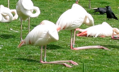 Nu dan een foto van lichtroze vogels: flamingo's tijdens hun middagdutje. Zou de kleur van de rode ibissen op dezelfde manier als bij de flamingo's ontstaan? Dus door veel rode/roze garnaaltjes te eten?
