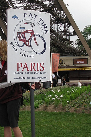 Een paar straten van de Eiffeltoren houdt Fat Tire Bike Tours kantoor. Het is een goed georganiseerd, Amerikaans fietsverhuurbedrijfje dat inmiddels ook fietstochten organiseert in Berlijn, Barcelona en Londen. En goed verstopt in de Franse straatjes. Dus om te voorkomen dat iedereen verdwaalt op weg naar de fietsenverhuur, is het verzamelpunt bij de Eiffeltoren. En dan heb je mooi de Eiffeltoren ook al gehad, want tijdens het wachten vertelde de gids al wat wetenswaardigheden over het bouwwerk.