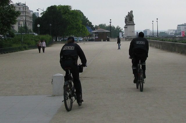 Langs de Seine en bij de Eiffeltoren zagen we veel politie op de fiets. Ze waren vooral bezig de souvenirverkopers onder de toren weg te jagen. Die liepen te leuren met ringen vol met Eifeltorentjes in alle maten en soorten.