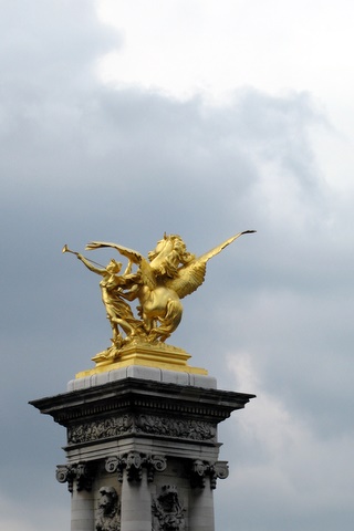 Op de linkeroever van de Seine bij de Alexander III-brug (pont Alexandre III, rive gauche) staat dit beeld. Het is 'La Renommee au Combat', gemaakt door Pierre Granet. Het stelt de Romeinse godin Fama voor, samen met het vliegende paard Pegasus. Fama was de godin van de roem en populariteit. In de Griekse mythologie is ze bekend als Pheme, godin van de geruchten en roddels. Met haar bazuin verspreidde ze geruchten (he, rondbazuinen).