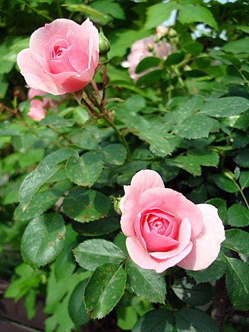 Liet ik vorige week nog zien hoeveel knoppen er in de roos in de tuin zaten, deze week kun je zien hoe het er uitziet als ze in bloei staan. In 'n vaas vind ik lichtroze rozen wat saai, maar aan zo'n hele plant zijn ze wel mooi.