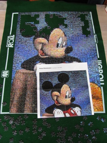 Dit was even een pittige puzzel. De Mickey Mouse is namelijk opgebouwd uit allemaal frames uit allerlei Disney-films. Toen we bijna klaar waren, had ik echt het idee dat we niet genoeg stukjes hadden om de oren en het gat in z'n hoofd te dichten. Gelukkig was de puzzel compleet en is het helemaal goed gekomen. Nu ligt Mickey weer 'gebroken' in z'n doos te wachten op de volgende puzzelaanval.