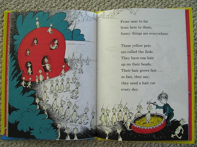Deze week ging er ineens een lichtje bij me op: die tekeningen lijken wel verdacht veel op tekeningen van dr. Seuss, een zeer bekende Amerikaanse prentenboekenschrijver uit de jaren '60-'70 (Cat in the Hat, The Gringe, Green Eggs and Ham). Weer hulde aan Google, want met de zoekwoorden 'dr. Seuss haircut' kwam ik een zelfgemaakte ansichtkaart tegen. Ik heb de maker gemaild met de vraag uit welk boek het komt. Ik kreeg al snel antwoord: het komt uit "One fish, two fish, red fish, blue fish" en het origineel gaat zo: