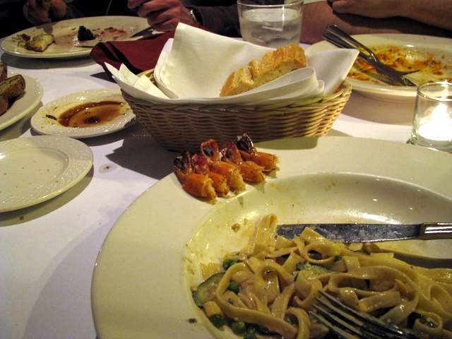 Frank houdt niet van garnalen en scampi's, dus als de gelegenheid zich voordoet dan bestel ik ze. Deze keer was het bij de Italiaan. Erg lekker, maar het blijft toch een beetje vies eten: garnalen tussen de tagliatelle vandaan vissen, bij de staart pakken en afhappen. Of had ik ze gewoon met mes en vork te lijf moeten gaan?