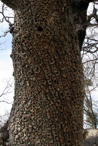 Eerst dacht ik dat het een soort kunstobject was, dat iemand voor de lol eikels in een boombast had geduwd. Een vriendin dacht dat het werk was van een eekhoorn. Zij zat dichter in de buurt: het blijkt een voorraadboom te zijn van een familie spechten.