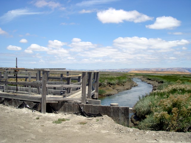 De Alviso marina wordt allang niet meer gebruikt. Maar als je over de dijken er doorheen fietst zie je nog allerlei herinneringen aan vroeger tijden. Zoals dit sluisje met 'n waterstroom erachter.