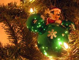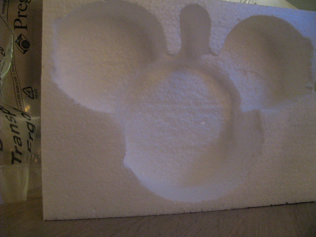 Het lijkt net of de piepschuimen Mickey-uitsparing een dikke buil op z'n hoofd heeft. Daar zit natuurlijk het haakje om de kerstbal op te hangen.