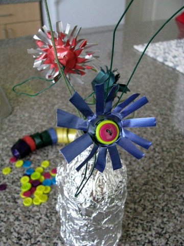 Ik vond het leuker om de gekleurde kant naar boven te hebben. De Margriet liet steeds de 'zilveren' kant zien. Verder heb ik voor sommige bloemen twee cups gebruikt, en twee knoopjes als hart. Ook heb ik bloemen in de knop gemaakt: gele, paarse of rode cup als knop gedraaid en daar een groene cup omheen gevouwen. Ik vind de open bloemen leuker om te zien.