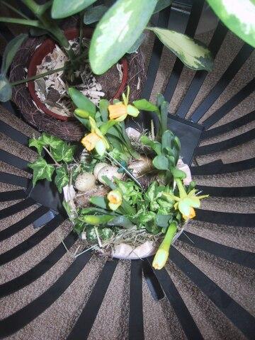 Dat is het leuke van een voorjaarsverjaardag: je krijgt altijd wel een vrolijk potje of mandje met bloemetjes. Dit jaar waren het narcisjes, blauwe druifjes, viooltjes en tulpjes.
