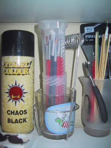 Ook de doos met alle Warhammer-spullen is uitgepakt. We hebben er op zolder een mooie werkbank voor.