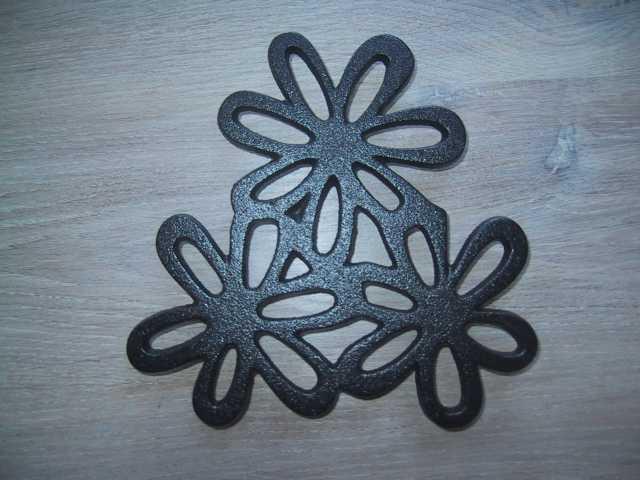 Ik was de kurken onderzetters wel zat, dus ik heb bij IKEA een paar gietijzeren bloemen-onderzetters gehaald.