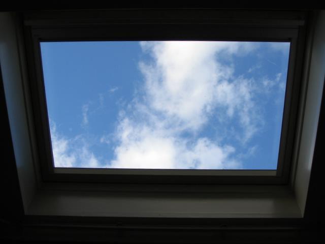 We hebben van die grote dakramen in de uitbouw van de woonkamer zitten. Het nadeel is dat je bij een beetje regenbui moet schreeuwen om elkaar te verstaan. Maar een voordeel is dan weer dat je steeds van die mooie wolkenpartijen ziet als je omhoog kijkt. Nou ja... als het niet regent tenminste.