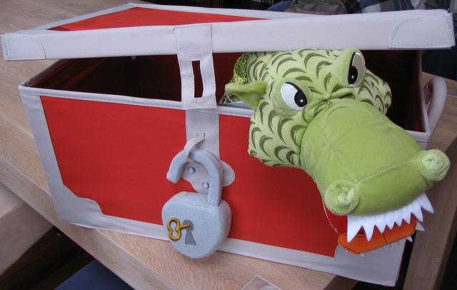 Een neefje van me was laatst jarig. En hij wilde 'n groene draak van de Ikea als cadeau. Omdat wij zo'n beest natuurlijk niet los in huis willen hebben, hadden we 'm opgesloten in 'n kist met 'n groot slot erop.