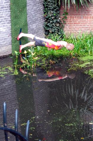 Ook dit is weer zo'n stukje Amersfoortse grachtenkunst. Verf 'n paspop in vrolijke kleuren, hang wat nepgras tegen 'n muur en timmer de paspop er tegen aan. Het klinkt eenvoudig, maar je moet d'r maar op komen.