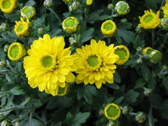 Van 'n vriendin kreeg ik laatst 'n bolchrysant. Op zich heb ik niet zoveel met chrystanten, maar toen de bol eenmaal begon met bloeien werd'ie steeds mooier. Op het laatst was 't één grote gele bal. En dat stond toch wel erg mooi in de tuin.