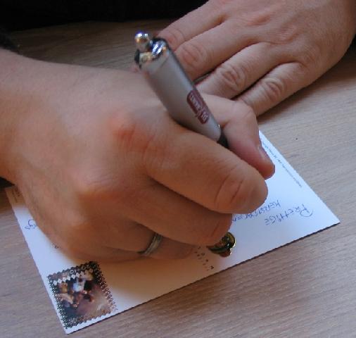 Hoewel Manon de meeste van onze kerstkaarten heeft geschreven, zijn 't hier toch echt mijn handen die met 'n JijBent-pen bezig zijn op 'n kaart te schrijven.