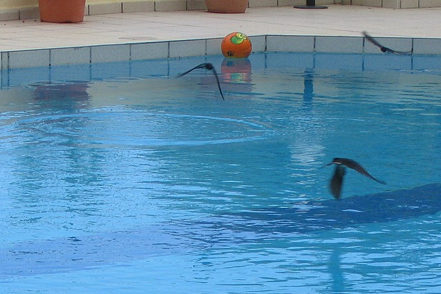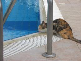 Niet alleen de katten dronken uit het zwembad, ook de zwaluwen vonden het water erg smakelijk. Dus 'n paar keer per dag kwam er 'n bataljon zwaluuwtjes aanvliegen die dan om en om in duikvlucht 'n hapje water opschepten. Een erg leuk gezicht... (filmpje)