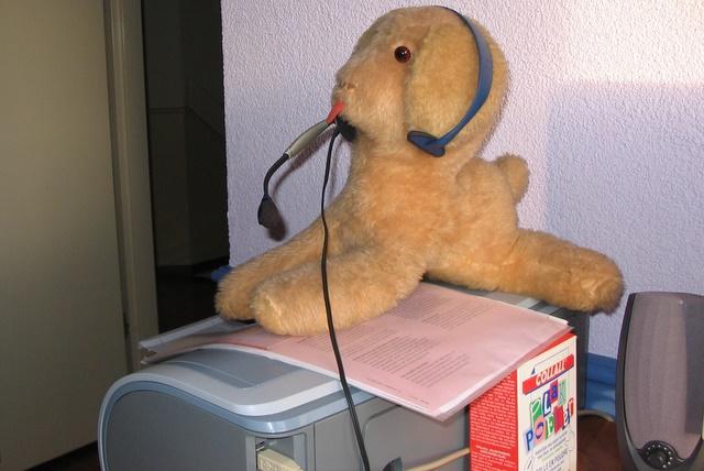 Met deze hond heeft mijn moeder als kind gespeeld. Nu staat hij op mijn werkkamer en is gepromoveerd tot headsethouder, met bijbehorende secundaire arbeidsvoorwaarden: van middernacht tot zonsopgang mag hij gebruik maken van de pc.