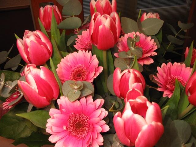 Voor m'n verjaardag (dank je) kreeg ik van Manon een boek en deze bos bloemen. Gerbera's zijn mijn lievelingsbloemen en tulpen zijn fantastisch voor het maken van foto's. Maar waarom ze nou roze bloemen had gekozen, snap ik niet helemaal.