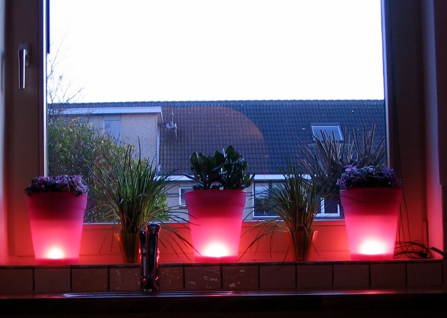 Ja hoor, voor dit soort mutsendingen ga ik helemaal: plastic bloempotten met een lampje er in. De batterijen waren wel al na vier avonden leeg, maar leuk was 't wel.