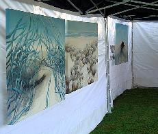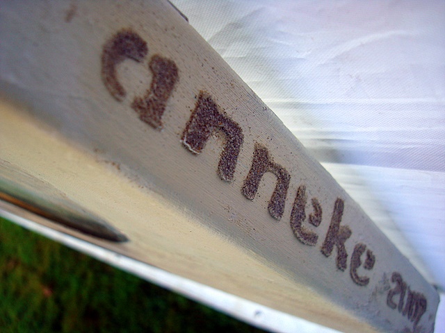 Anneke Bagerman heeft 'n leuke manier gevonden om haar schilderijen te "signeren". Met 'n malletje zet ze de letters met allerlei materialen op de zijkant van het doek. Zoals hier dus met zand.