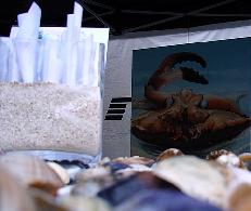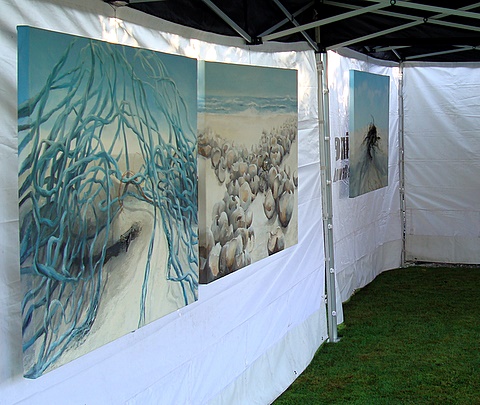 Hier is nog een impressie van de 'Stille reis' waar ik het dinsdag over had. In het schilderij met de zee-egels zit de bodem van een petfles verwerkt, in de andere een loden naamplaatje en een kluwen touw. In weer een ander schilderij zit een bepokt onderbeentje van een voetballerpop verwerkt. Het is de bedoeling dat de kijker gaat jutten met de ogen en steeds nieuwe dingen ontdekt.