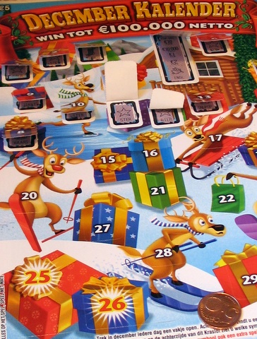 Als ik een kraslot zie, moet ik 'm altijd openkrassen. Dus toen ik deze adventkalender na ontvangst bijwerkte (gekregen van Sinterklaas, dus vijf vakjes achter elkaar krassen, lekker!), werd mijn lief een beetje boos. Want het bleek niet onze kraskalender te zijn, maar ZIJN kraskaart... Nu blijf ik er netjes vanaf, maar het kost wel moeite hoor.