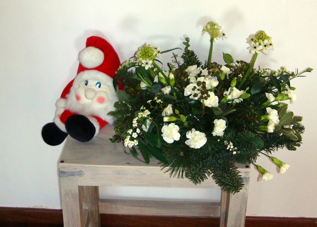 Helemaal geinspireerd door de afgelopen witte dagen -en een middag kerststukken maken met de moeder van mijn linkerbuurman en een dag kerststukjes maken met de kleuters op school- heb ik afgelopen zaterdag nog twee stukken gemaakt. Dit is de grote schaal, die is voor schoonbroer en -zus in Nootdorp. Het kleine stukje staat bij de buurtjes rechts (links hebben ze natuurlijk werk staan van hun eigen 'leverancier').
