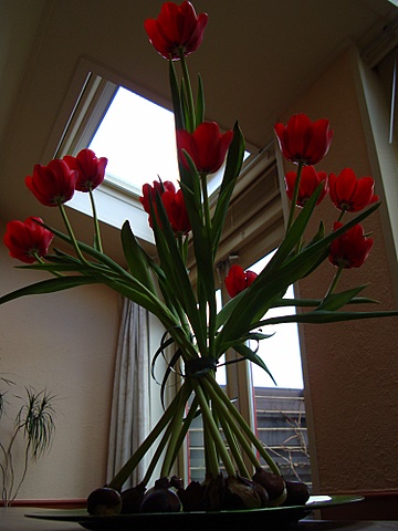 Nou wist ik al wel dat een boeketje draaien moeilijker is dan het lijkt. Maar als er dan ook nog bolletjes aan hangen... Dus ik heb een beetje gesmokkeld. Maar het resultaat mag er absoluut zijn! En ik verbaas me steeds over de mooie rode kleur van de tulpen.