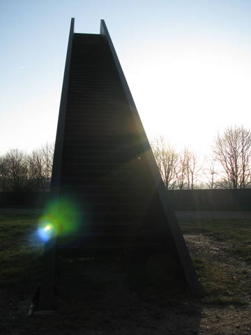 Langs de Zuilense Ring staat dit kunstwerk. Ik durfde het niet aan om omhoog te klimmen en het uitzicht te ontdekken. Straks houden de traptreden niet op en kom ik bij een reus in de wolken terecht...