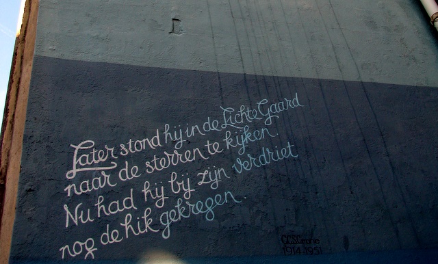 Als je door Utrecht wandelt, kom je hier en daar gedichten op muren tegen. Deze zie je als je van 't Wed naar de Stadhuisbrug loopt.