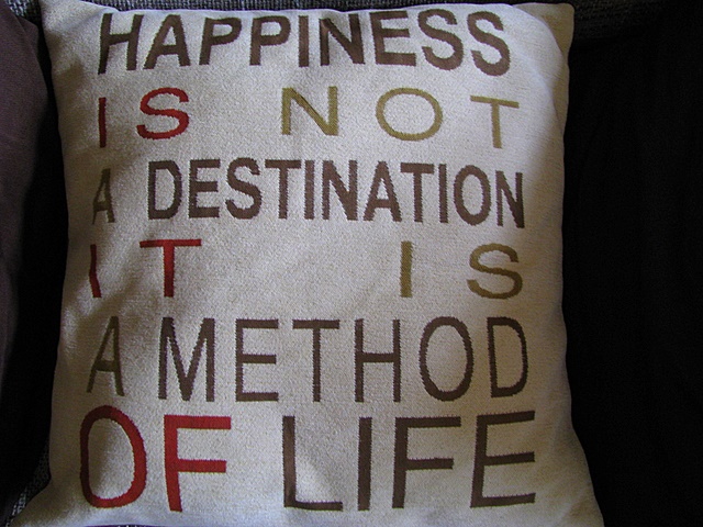 Ik heb thuis m'n eigen huis-tuin-en-keuken-swami rondlopen. En een van zijn lijfspreuken is 'Geluk is een keuze', of een Engelse variant er op: 'Happiness is a journey, not a destination'. Dus toen ik dit kussen zag liggen met 'Happiness is not a destination, it is a method of life', kon ik 'm natuurlijk niet laten liggen. Nu ligt het kussen op onze loveseat.
