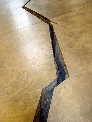 We zagen dat er een Unilever-serie was, dus wij naar binnen. Want wat moeten we ons daar nou bij voorstellen? Stellages met pakken wasmiddel en Unox-worsten? Dus wij zoeken, maar we zagen niets bijzonders. Behalve een joekel van een barst in de vloer van de lege hal. Aha, DAT was het kunstobject! Het heet Shibboleth en is van Doris Salcedo.