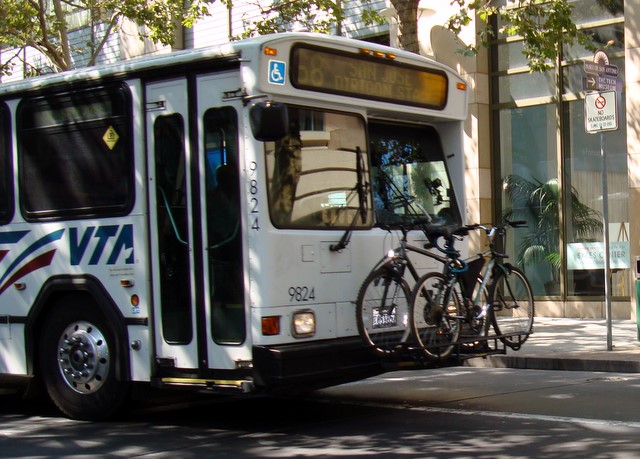 Toen we vorige maand in San Jose waren, konden we de oplossing met eigen ogen zien. Voorop de bus zit 'n "twinny load" en daar kunnen twee fietsen op.