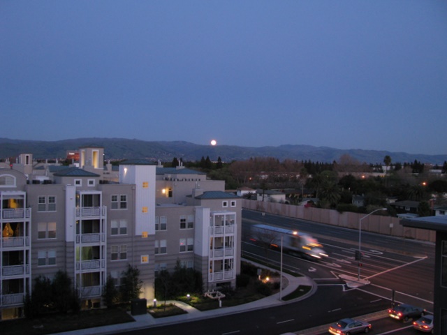 Had ik het afgelopen dinsdag over het zonnetje in huis, nu iets over de maansopkomst in Californie. Wat ging dat snel! Binnen een klein kwartiertje zagen we de maan achter de berg opkomen. Het leek net of er iemand aan een touwtje trok om de maan boven de bergen uit te hijsen.